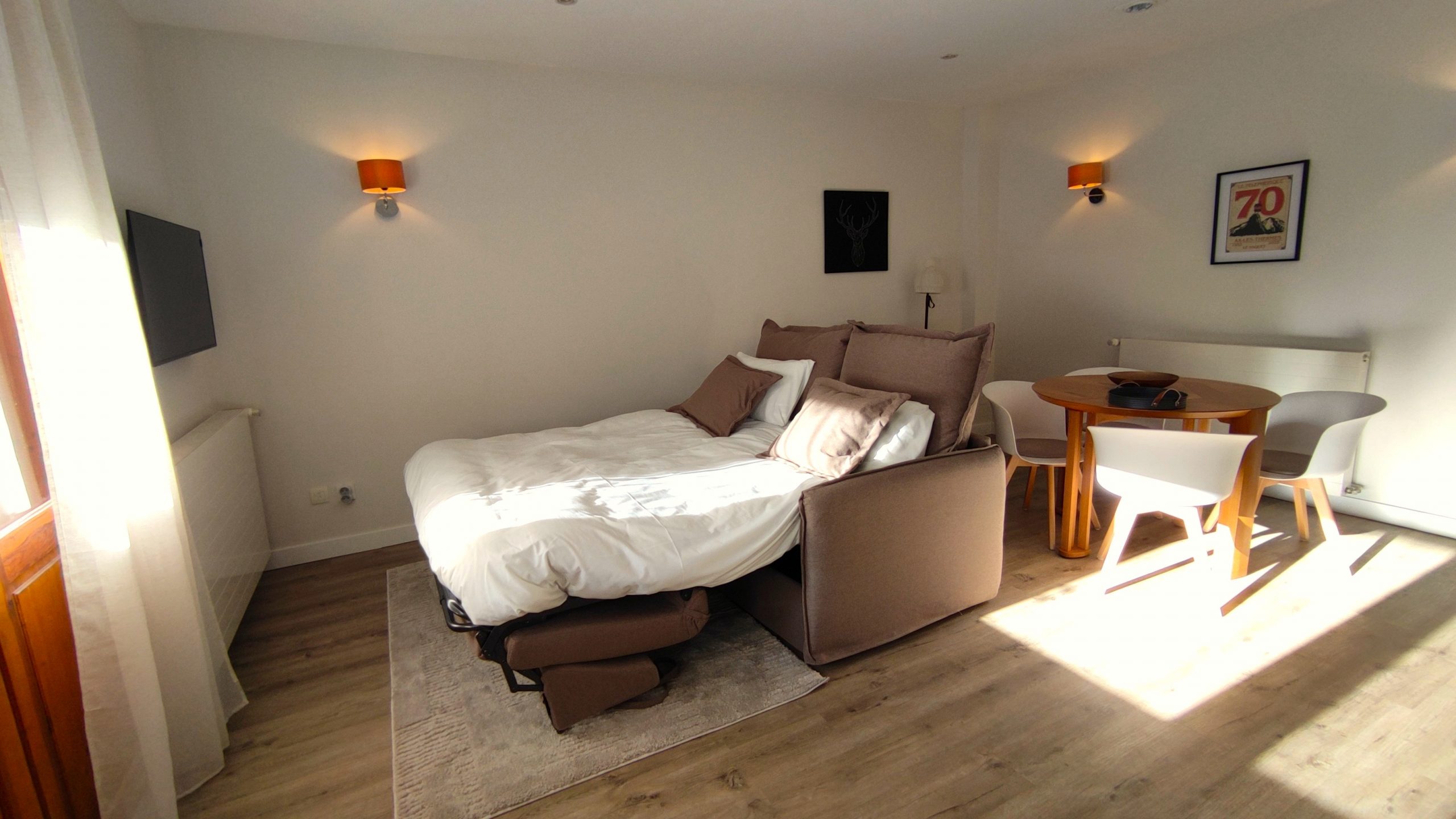 25 m² Living area: Fully equipped kitchen with microwave, toaster, kettle, Italian coffee machine, dishwasher, fridge. Lounge with dining table for 4 people, Smart TV, double sofa bed, games and cards available.