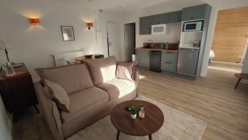 Se Chouchouter : Pièce à vivre de 30 m² avec cuisine équipée, salon, SmartTv, Canapé et vue sur le parc.